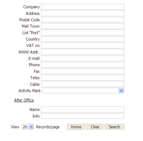 When searching for a specific COMPANY please use the info you have in the appropriate box. Use as little as you think is unique for that company and press the SEARCH button. The search is now provided by the characters you have entered from the beginning of field where you have entered data.